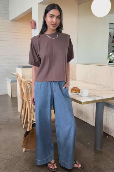 Step into effortless style with our Wide Leg Drawstring Pant by Ceres. Crafted from a mid weight denim using 31% TENCEL™ with a soft hand feel. Featuring an elastic waist and drawstring, a wide leg silhouette, deep hems, and handy patch pockets at the back, these pants are the perfect blend of comfort and chic. These will be your new go-to for everyday wear.