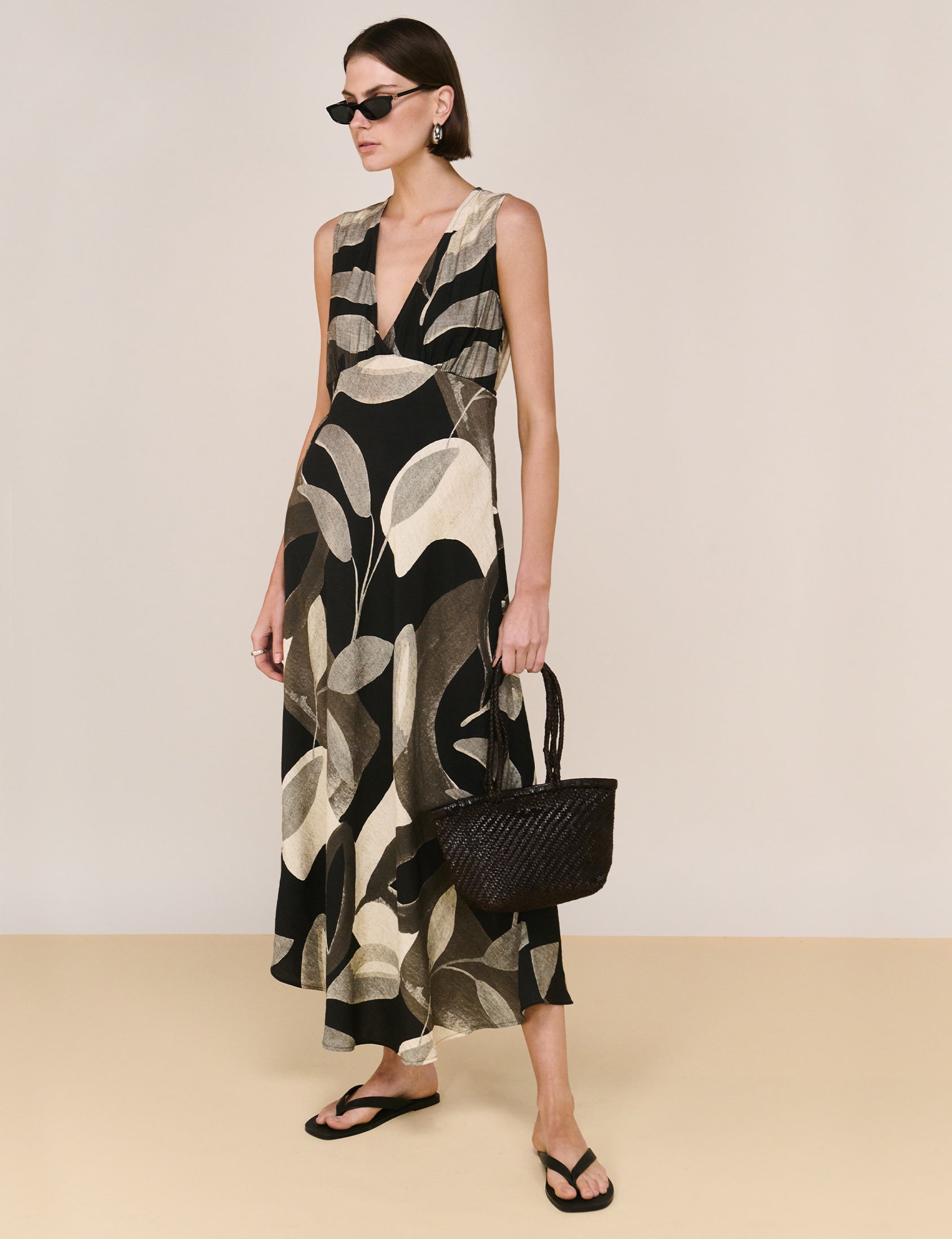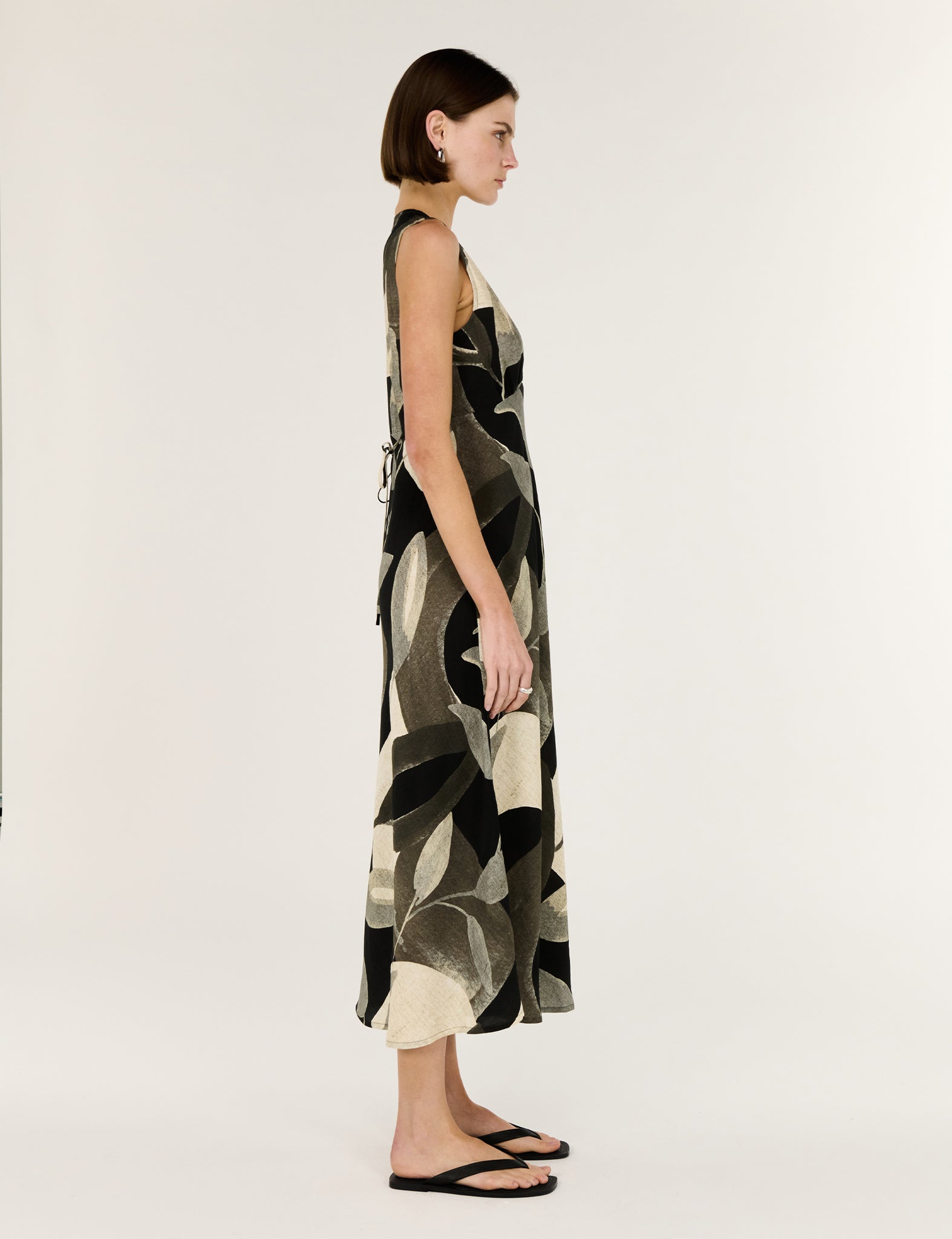 The Leona Dark Leaf Bias Midi Dress is a refined statement piece designed to flatter from every angle. Cut on the bias for a fluid, body-skimming fit, this sleeveless silhouette features a soft V-neckline and adjustable tie-back detail to cinch the waist as desired. Finished in the Dark Leaf Garden print, it moves beautifully with the body while maintaining an effortless, elevated feel. An easy option for long lunches, events or warm evenings.