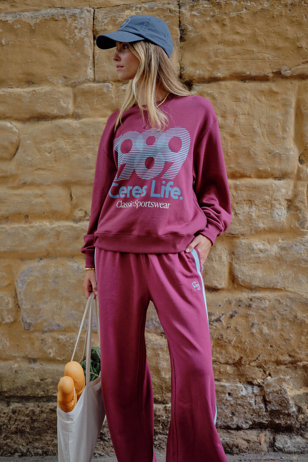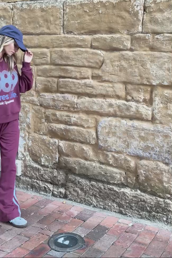 Gigi Wide Leg Terry Trackpant - Washed burgundy sky blue side stripe